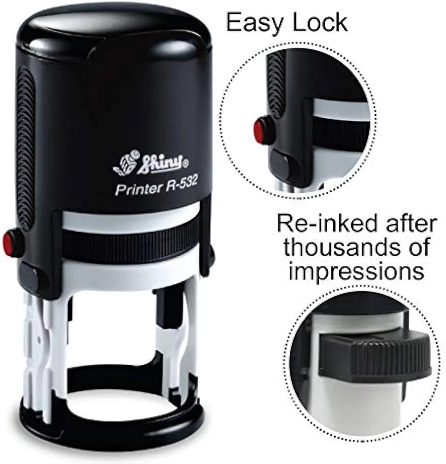 The Shiny R-532 is a 32mm round self-inking stamp ideal for logos, seals, teacher stamps, office use, and approval marks. Durable body, smooth stamping, and clean impressions. Easy to customize with your design.